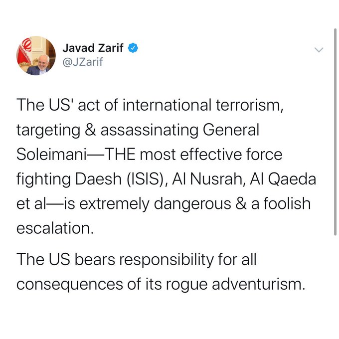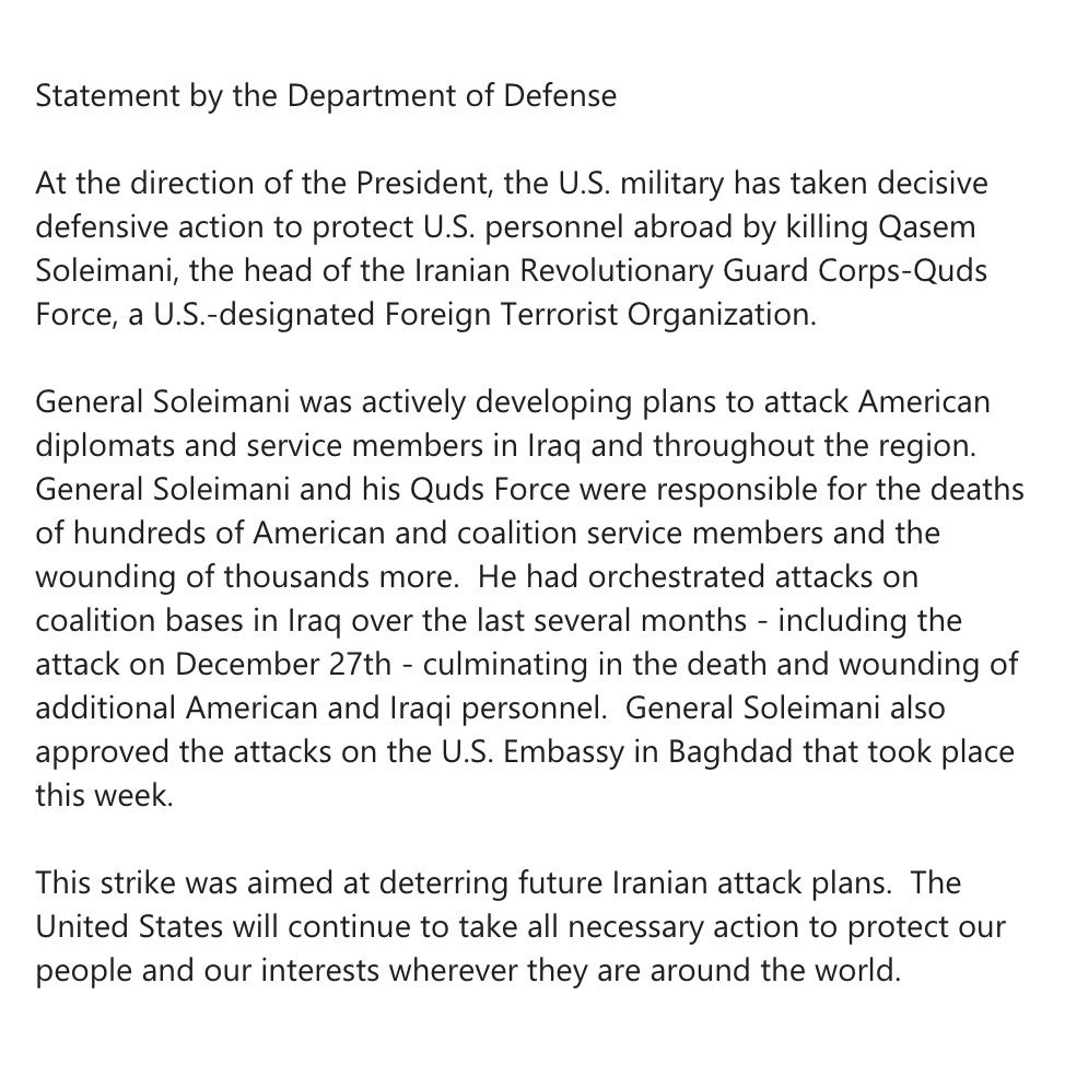 1. There are unconfirmed reports that Qasem Soleimani commander of Qods Force (Iran's external security agency) has been killed in drone strikes. If true, this will be a major moment in US-Iran relations & Supreme Leader will undoubtedly see this as a major provocation/act of war --- https://imgur.com/bbRWLI8 https:/i.imgur.com/S1m3po4.jpg https://imgur.com/A0BErSV https://imgur.com/7fCcfko ... Copied to Clipboard!
